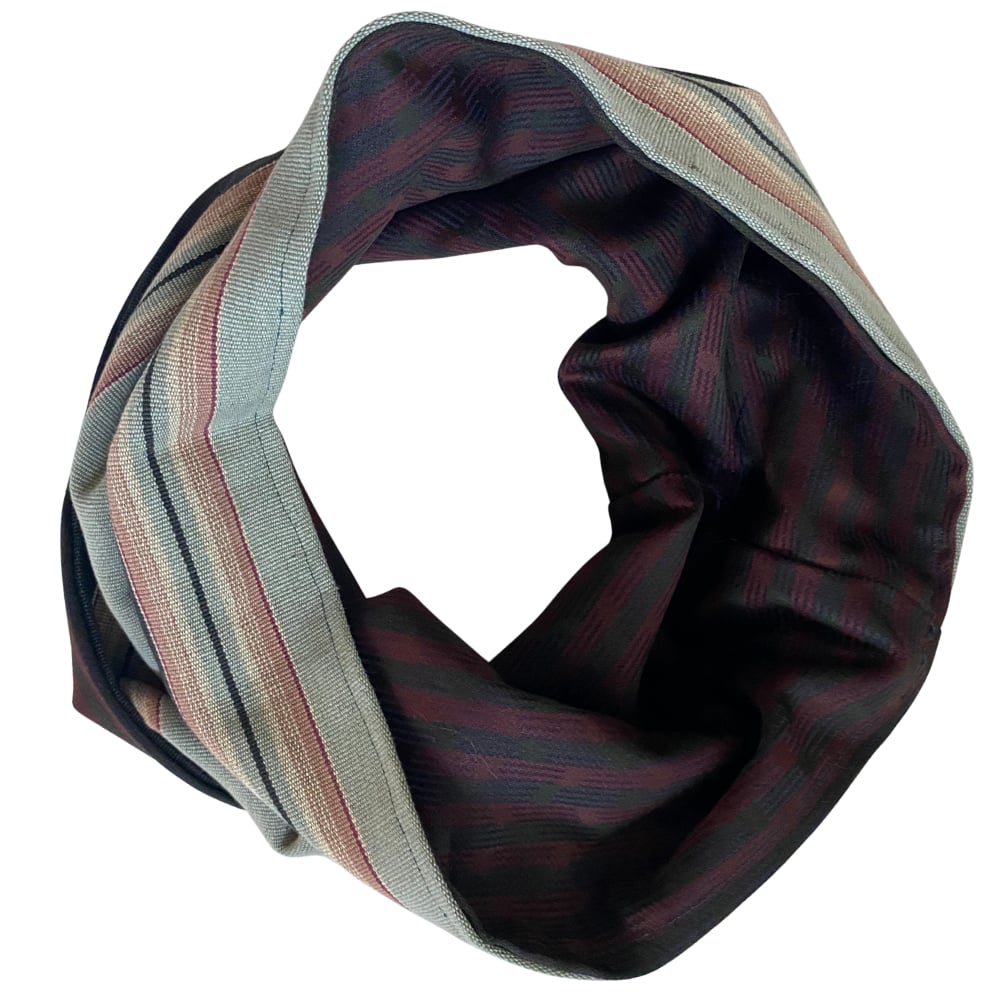 Cowl Made from upcycled material. Sage, Navy, Red and Khaki Striped Upholstery Fabric and Navy, Forest and Maroon Jacquard Weave fabric. One available with Same Fabric on Both Sides. Hand Stitched by Gurtie Hansell.