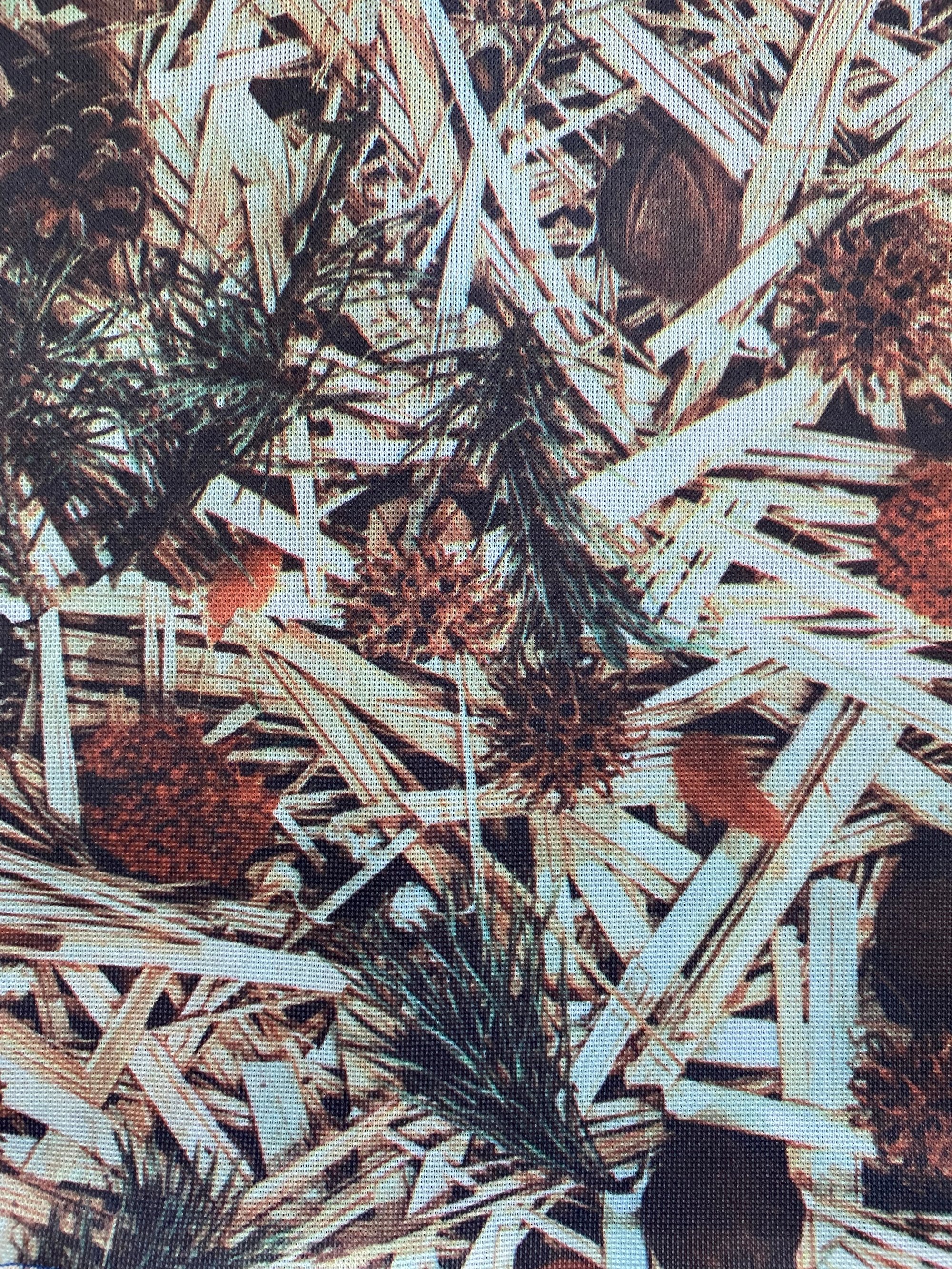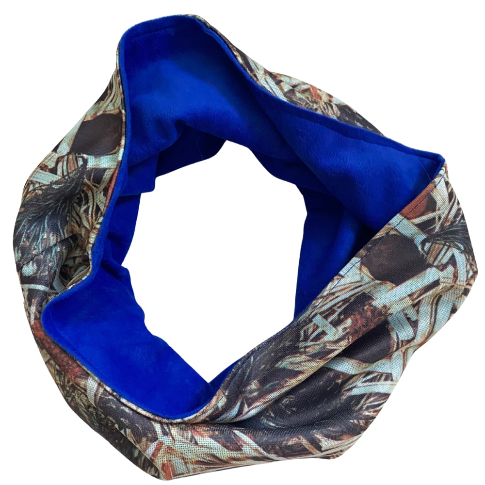 Cowl Made from upcycled material. Vivid Blue Faux Vlevet with vintage Conifer Camo. Hand Stitched by Gurtie Hansell.