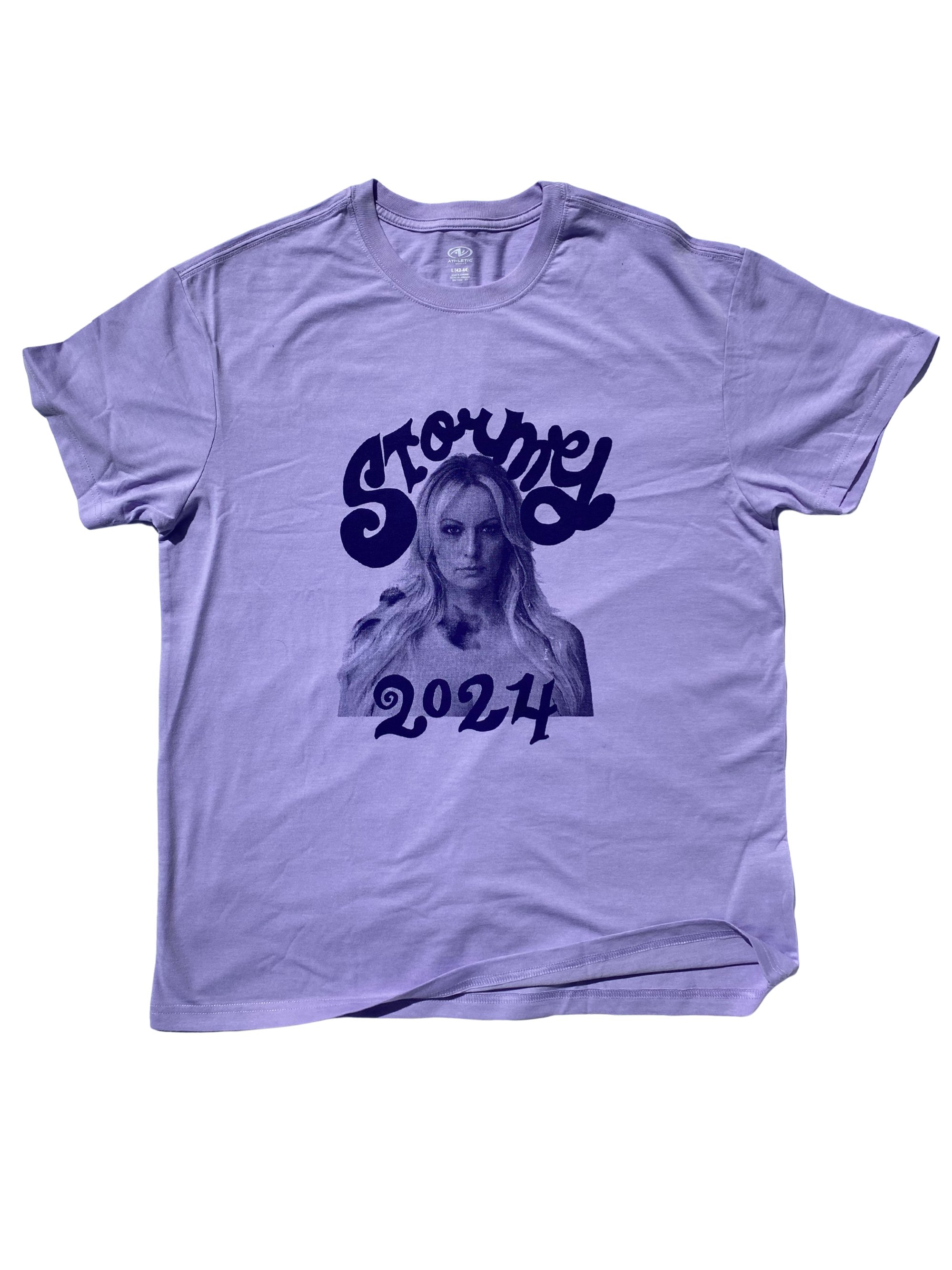 Stormy 2024! Gildan 100% cotton llac tee, with purple hand drawn and screenprinted image and type.